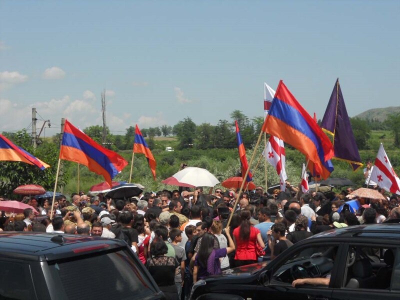 Сотни людей приветствуют верховных предводителей Армянской и Грузинской церквей на армяно-грузинской границе, 10 июня 2011 г.