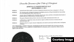 Губернатор штата Мэриленд, Мартин О'Мэлли опубликовал декларацию по случаю Дня независимости Армении, в котором также упомянул Нагорный Карабах как новую формирующуюся демократию.