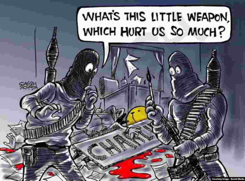 Политические карикатуристы со всего мира ответили рисунками террористам на убийство своих коллег-карикатуристов из французского журнала Charlie Hebdo.