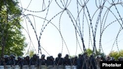 Немного выше площади Франции, на проспекте Баграмяна, полиция продолжает контролировать ситуацию, выставив кордон. Полиция также растянула двойную колючую проволоку с прикрепленными к ней светошумовыми гранатами.