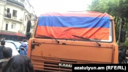 Протестующие укрепили на лобовом стекле грузовика армянский триколор, закрыв для водителя обзор, чтобы он не мог двигаться вперед.