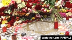 цветы и зажигают свечи как у посольства Франции, так и на площади имени Шарля Азнавура.