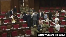 Председатель НС Ален Симонян сделал замечание депутатам оппозиционной фракции «Айастан» Армену Рустамяну и Агнессе Хамоян за выступление с места. После этого началась потасовка. Ален Симонян пригласил в зал сотрудников безопасности и распорядился отключить прямую трансляцию.