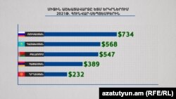 В соответствии с этими данными, в январе-сентябре 2021 года самая высокая среднемесячная зарплата среди государств-членов ЕАЭС была в России - 734 доллара США, вторым следует Казахстан - 568 долларов, на третьем месте Беларусь - 547 долларов. В этот период средняя заработная плата в Армении составила 389 долларов. Пятерку замыкает Кыргызстан, где средняя зарплата составила 232 доллара.