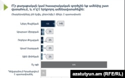 Какие ожидания участники опроса возлагают на правительство? 12% опрошенных считают, что правительство должно улучшить условия в армии, держать в центре внимания вопросы национальной безопасности и защиты границ. Для 9% первостепенным является установление мира. Еще 9% опрошенных ожидают от власти открытия Лачинского коридора, в то же время большинство респондентов посчитали закрытие Лачинского коридора самой большой неудачей правительства.