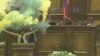 Два депутата оппозиционного блока «Елк» у трибуны парламента подожгли цветные файеры.